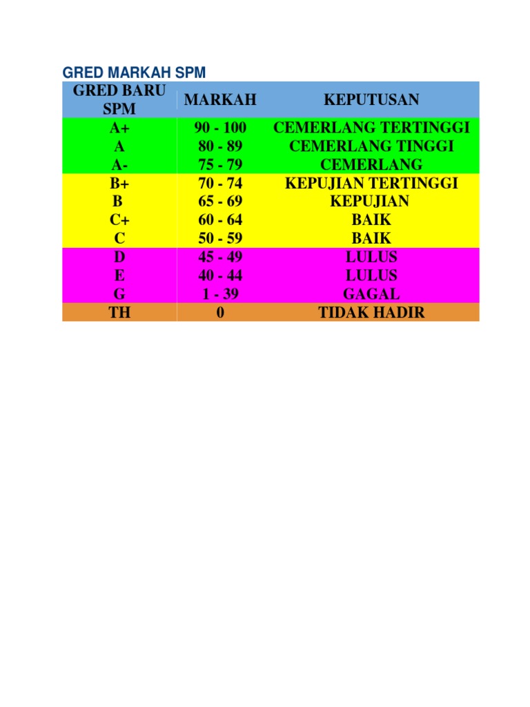 Panduan buat pelajar Tahun Enam Tingkatan Tiga Tingkatan Lima dan Tingkatan Enam. Sistem Gred Markah Peperiksaan UPSR PT3 dan SPM Terkini. Sekurang-kurangnya Kepujian Gred C dalam mata pelajaran Bahasa Melayu di peringkat SPMSPMV.